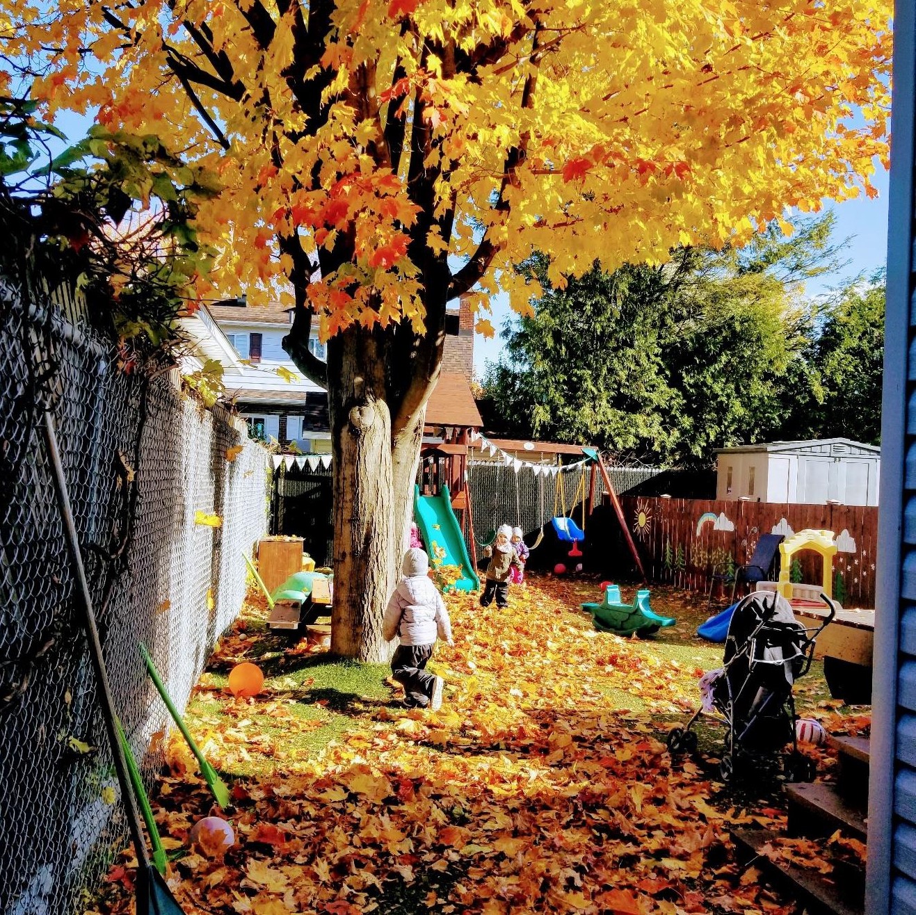 Mes enfants et tout le monde se retrouvent à l’extérieur. C’est l’automne. La cour est pleine de feuilles multicolores. Chacun a son petit râteau. Nous faisons la plus haute montagne de feuilles sous la glissade pour glisser dedans. Tout le monde s’amuse. Bébé est réveillé et un ami le promène en poussette. C’est chacun leur tour. Certains enfants préfèrent se balancer, d’autres cuisiner des recettes avec du sable, des roches et des feuilles ou d’autres, jouer au ballon. Le diner préparé le soir est au four, il cuit doucement. Vers 11 h, nous rentrons. Je range les vêtements d’extérieur dans les manches des manteaux, j’aide les amis à se déshabiller et je range leurs bottines. Je vais avec les amis dans la salle de jeux et on sort quelques jeux et casse-tête. Les amis sont excités et ils veulent jouer au chien et au chat.
