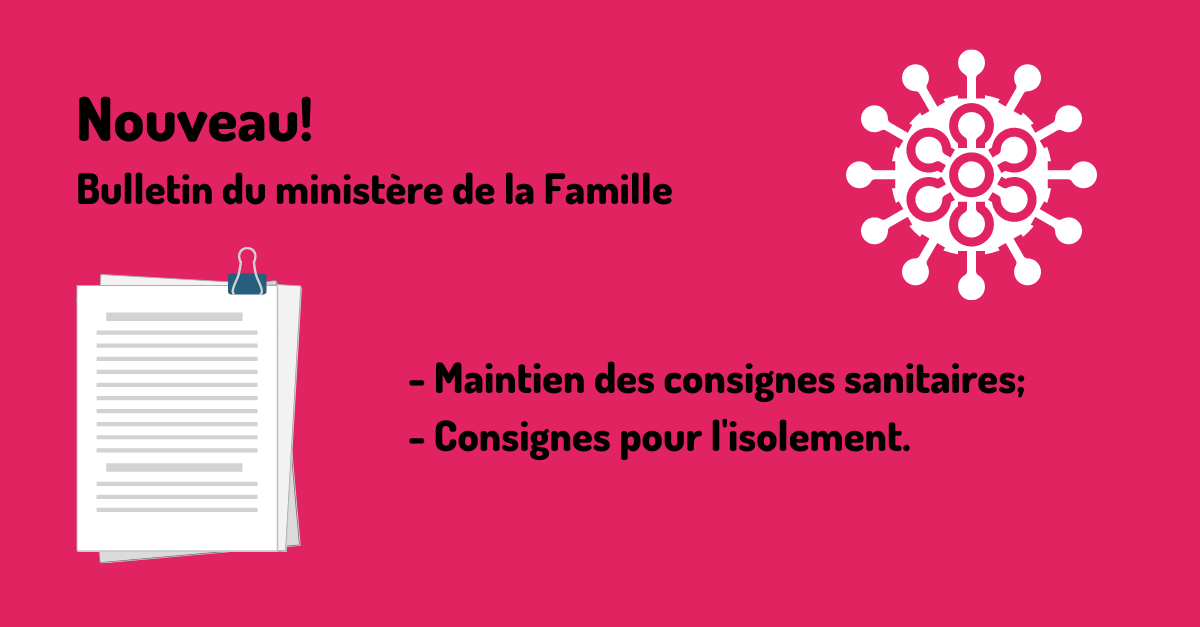 Le Ministère est en contact permanent avec la Direction de la santé publique et suit de près l’évolution du nombre de cas et d’éclosions dans les services de garde. Vous serez donc informés rapidement de tout changement dans les mesures à appliquer.