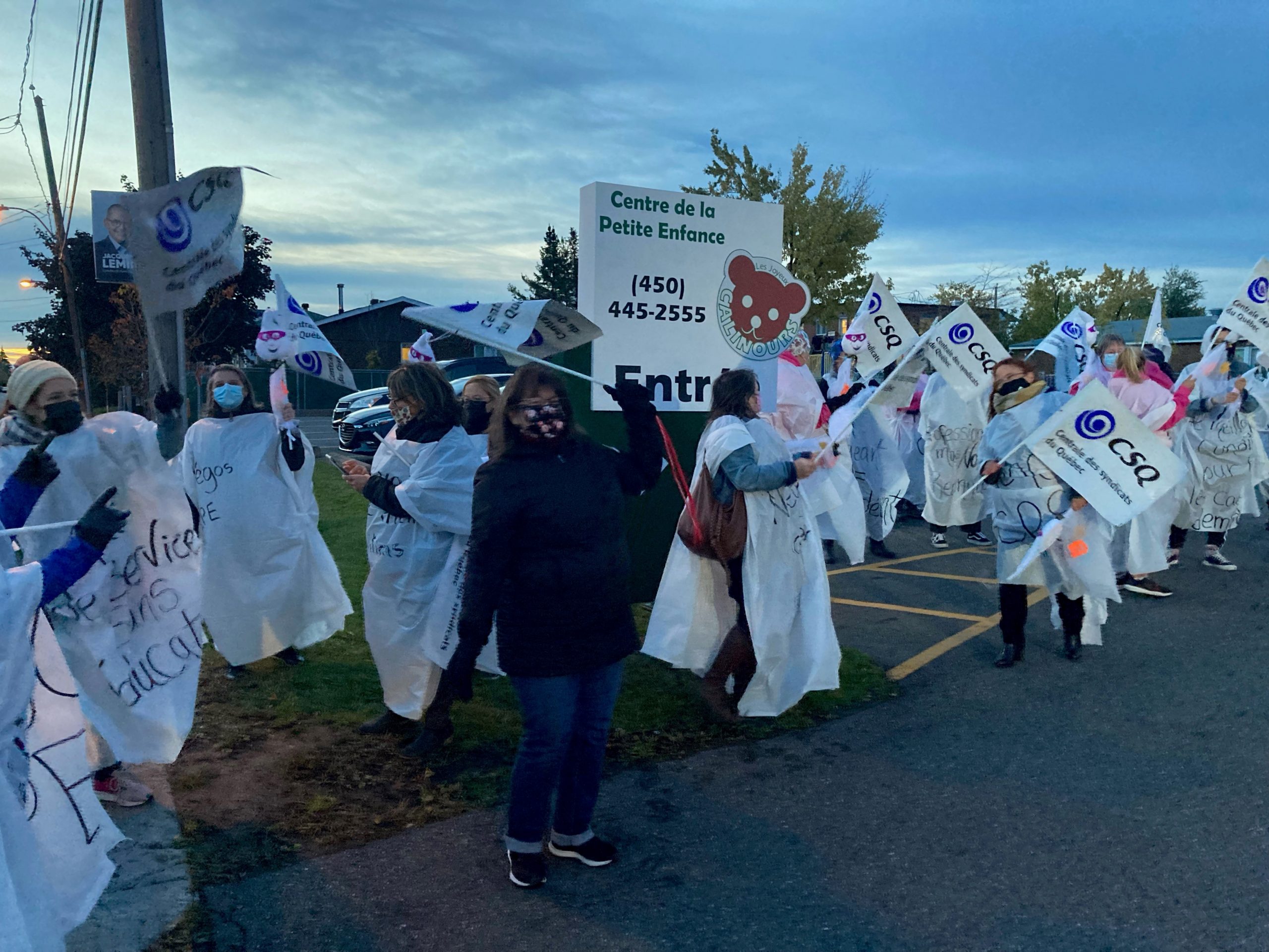 Déplorant le manque de volonté de la partie patronale d’améliorer de manière structurante les conditions de travail des intervenantes en petite enfance, des manifestantes ont distribué ce matin des tracts à des parents du CPE Les Joyeux Calinours à Saint-Hubert dont la directrice siège à la table de négociation comme représentante patronale.