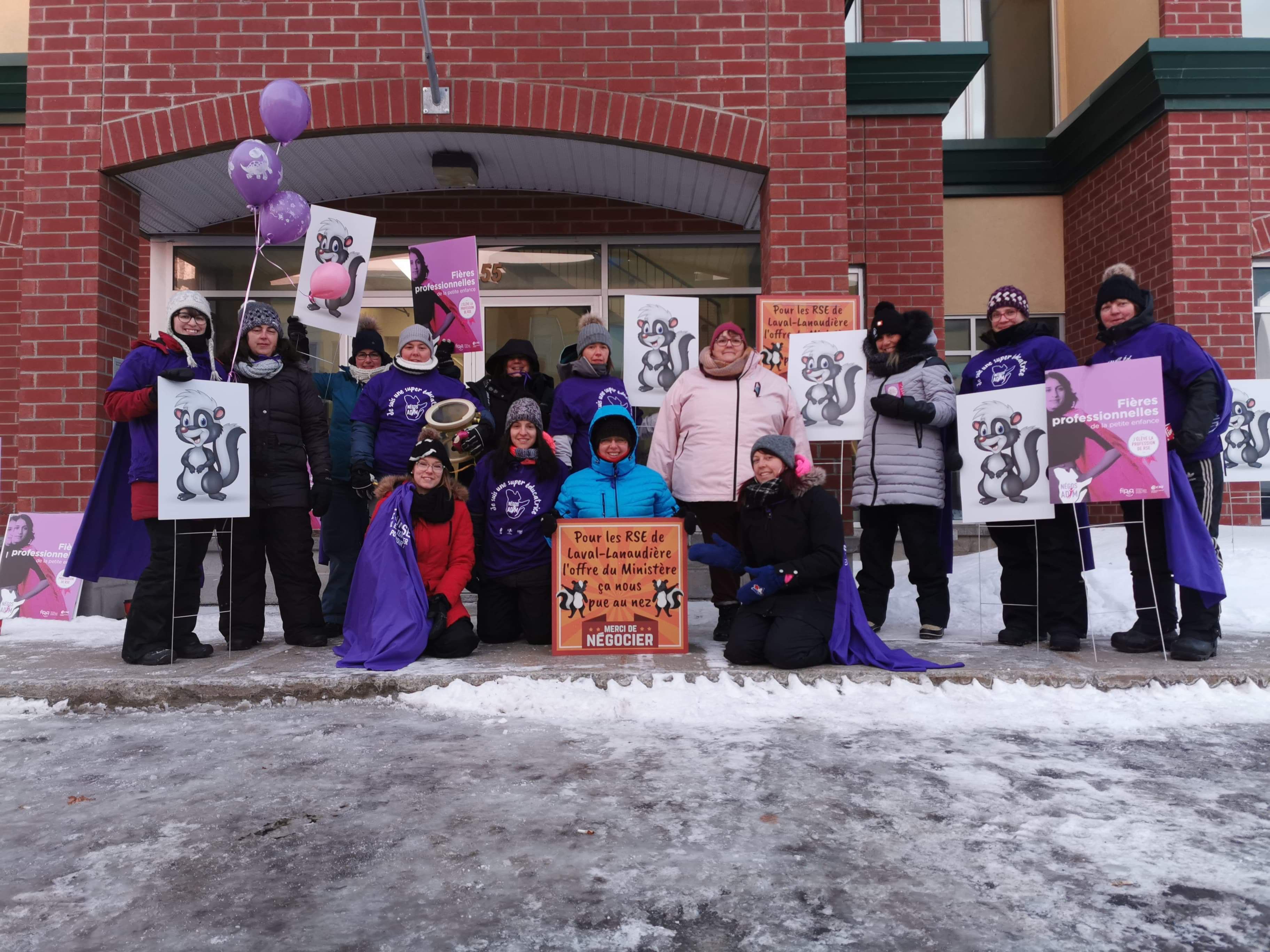 Des responsables en services éducatifs à la petite enfance (RSE), membres de la Fédération des intervenantes en petite enfance du Québec (FIPEQ-CSQ), ont manifesté tôt ce matin devant le bureau de la ministre responsable de la Condition féminine, Isabelle Charest, rue De la Chevrotière à Québec, pour lui demander de les appuyer dans le cadre de leurs négociations avec le gouvernement Legault.