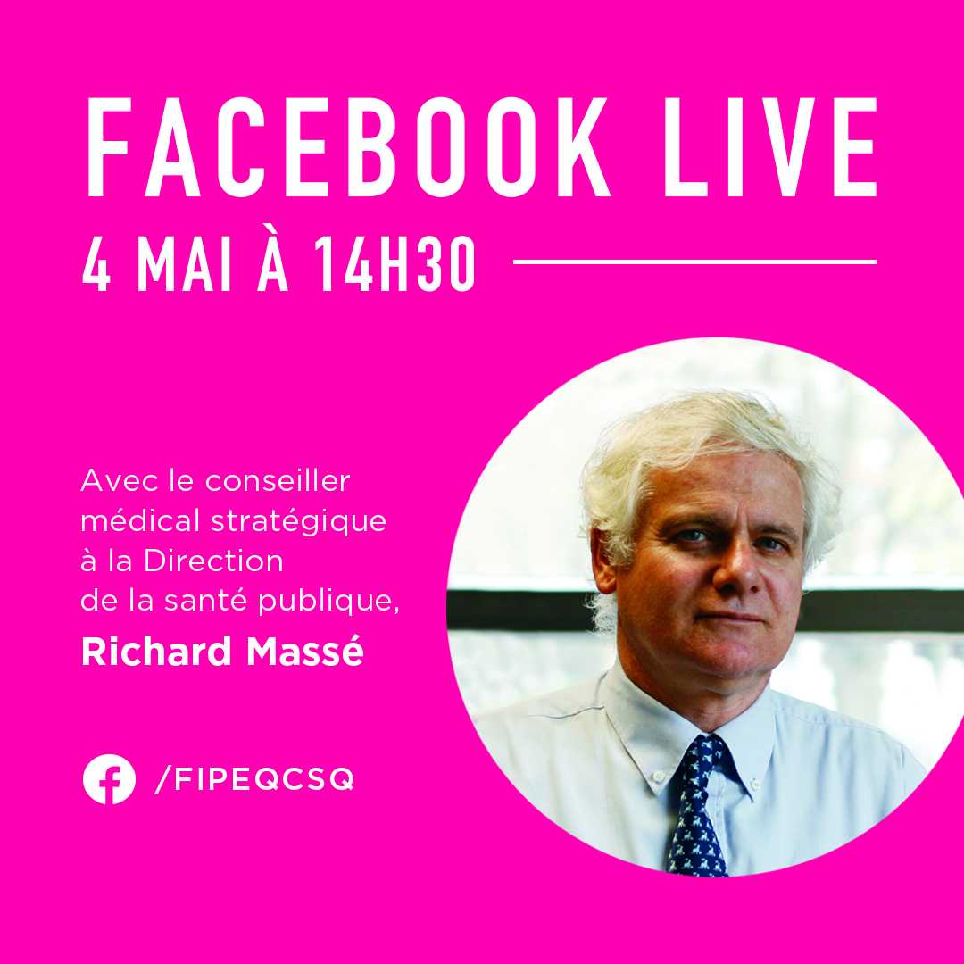 La Fédération des intervenantes en petite enfance du Québec (FIPEQ-CSQ) est fière d’annoncer que le conseiller médical stratégique à la Direction de la santé publique, Dr Richard Massé, participera à une séance de Facebook live avec les membres de la FIPEQ-CSQ le lundi 4 mai de 14h30 à 15h15.